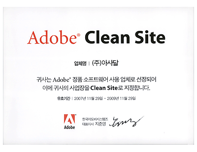 한국어도비시스템즈에서는 기업의 올바른 소프트웨어 사용과 건전한 정품 소프트웨어 사용 환경을 조성하고자, 소정의 인증절차를 거쳐 Adobe Software 정품 사용 모법업체를 선정하여 Adobe Clean Site로 지정하고 있음.