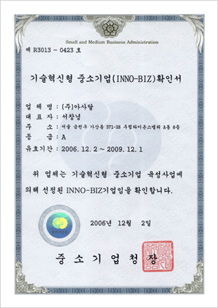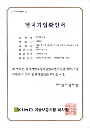 아사달은 신기술과 아이디어 개발 능력이 우수함을 평가 받아, 2003년 연구개발기업, 2005년 신기술기업, 2007년 연구개발기업으로 벤처기업 확인을 받음.