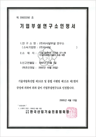 한국산업기술진흥협회로부터 기술개발촉진법 제16조 및 동법 시행령 제15조의 규정에 의하여 기업부설연구소 인정을 받음.