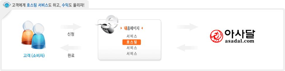 제휴사가 운영하는 홈페이지에 손쉽게 호스팅 서비스를 추가하여 고객에게 새로운 서비스를 제공하고 사이트의 규모를 키워 브랜드 가치를 높일 수 있는 서비스입니다.