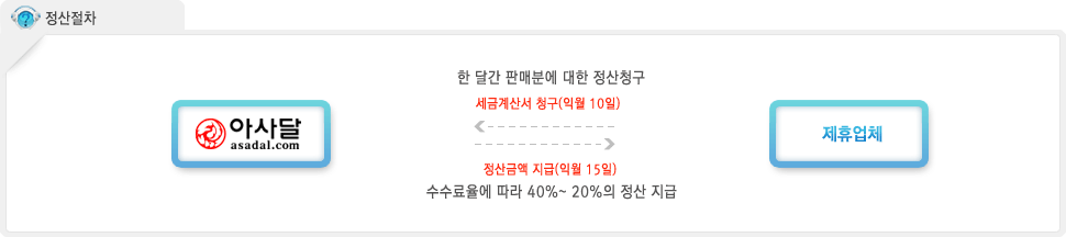 * 리셀러 제휴사는 한 달간(1일~말일)의 주문 정보를 파악하여 익월 10일까지 세금계산서를 ㈜아사달에게 발행함으로써 정산금액을 청구